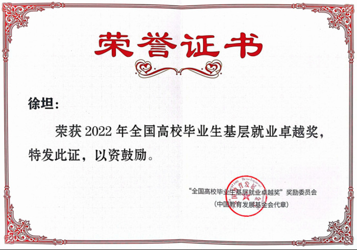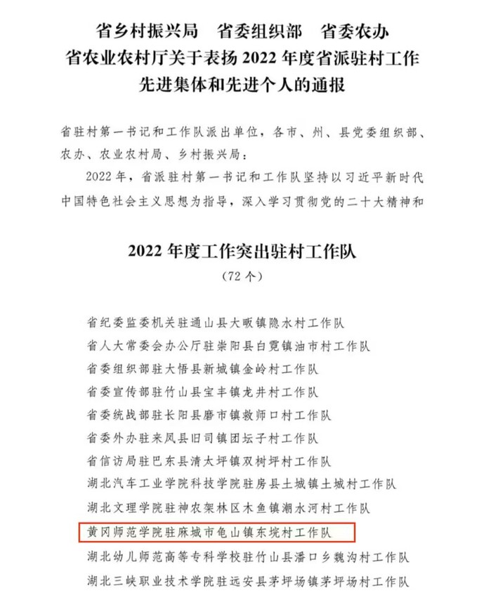 5.毕业生获评“全国高校毕业生基层就业卓越奖”,人才培养质量持续提升。学校2019届毕业生徐坦荣获2022年“全国高校毕业生基层就业卓越奖”。2023年,学校在台湾地区招生实现突破,4人获评第九届湖北省“长江学子”;“一站式”学生社区实现全覆盖;学生在“挑战杯”全国总决赛、中国国际“互联网+”大学生创新创业大赛等竞赛中均创历史最优成绩;2个团队在暑期“三下乡”社会实践活动中受团中央表彰;大别山农耕文化博物馆入选“百校百馆”湖北省“大思政课”实践教学平台。