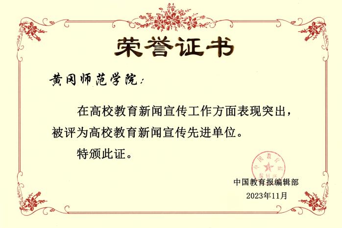 8.复建黄州府师范学堂校门,校园文化更加繁荣。2023年11月,复建的“黄州府师范学堂”校门落成,已成为学校新的标志性文化景观。2023年,学校重视校友文化建设,全年共募集社会捐赠资金8158万元,创历史新高,荣登中国高校捐赠收入前100名;学校先后荣获高校教育新闻宣传先进单位、年度新媒体传播创新本科高校、年度网络传播最具社会影响力高校等荣誉称号,新闻作品获湖北省高校新闻奖17项,官方微博获“微博造浪音乐节”湖北省第一名;在省教育厅组织的湖北高校相关工作专题培训班上作校园文化建设典型发言。