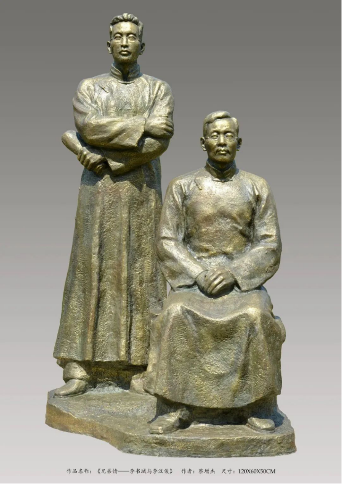 雕塑《兄弟情——李书城与李汉俊》采用现实主义和具象写实的艺术表现手法塑造了李书城与李汉俊两兄弟,通过纪念碑式的构图形式和垂直向上的衣纹造型,给人以庄重之感,传达出革命先辈的崇高精神气概。作品成功入选由省委宣传部、省文旅厅主办的“壮丽航程—庆祝中国共产党成立100周年湖北省优秀美术作品展”,后被省美术院永久收藏。