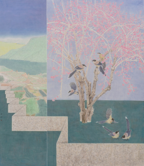 作品简介:作者通过长期在美丽乡村写生有感而创作的作品,该作品描绘的是美丽乡村建设后的景象,有红红的果树、欢快的鸟儿、早春的田野、一片片有机种植的田园、层叠的茶山、各类经济作物和绿水青山,一片祥和与欣欣向荣之境,表达了新农村建设新成果。作品用拼置的手法,运用传统工笔淡彩的表现手法,构图新颖,色彩明快,展现山河之美,抒写了湖北人民建设美丽乡村的发展成果,全景式展现新时代的新气象。