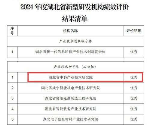 本网讯 5月10日,省科技厅公示2024年度湖北省新型研发机构绩效评价结果,湖北省中科产业技术研究院考评位列全省产业技术研究院(工业组)第一名,再次获评“优秀”等次。