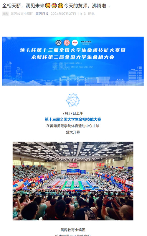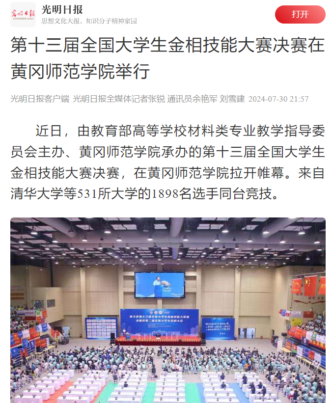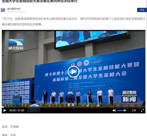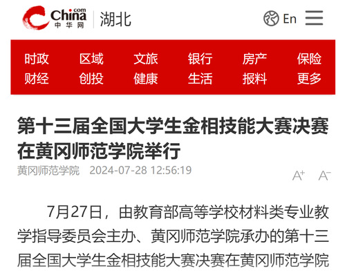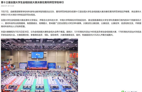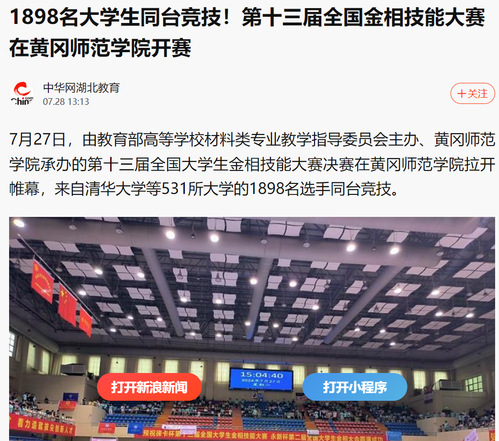 7月25日至30日,第十三届全国大学生金相技能大赛决赛在我校举行,来自清华大学等531所大学的1898名选手同台竞技。该大赛是材料类专业规格最高、制度最健全、规模最大、影响最广泛的全国性大学生学科赛事,受到媒体广泛关注,新华社、光明日报、中央广电总台国际在线、中国教育报、中国青年报、中新网、中华网、高校之窗、中国教育在线、新浪新闻、网易新闻、湖北日报、极目新闻、长江云、荆楚网、黄冈日报等众多主流媒体对大赛盛况进行了专门报道。