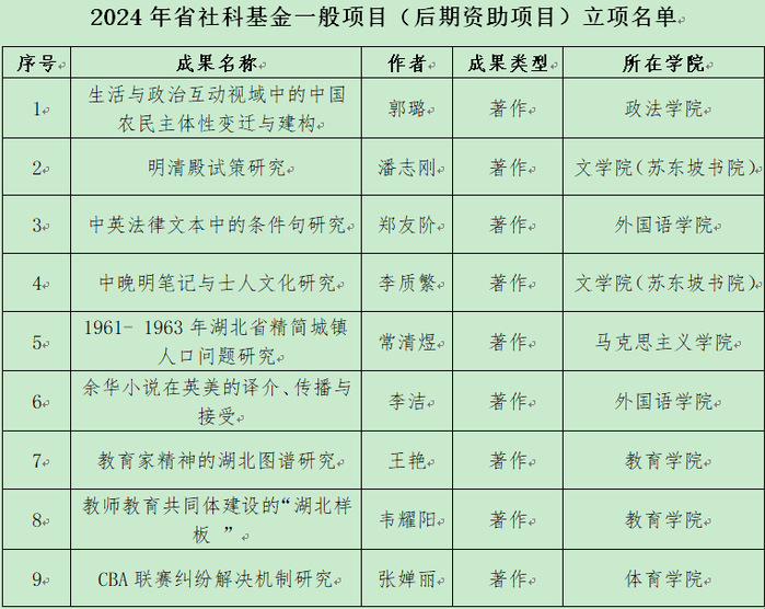 本网讯 近日,湖北省社会科学界联合会公布了2024年湖北省社科基金一般项目(后期资助项目)拟立项名单,我校共有9个项目获得立项资助,项目获批数量位列省属高校第七、地方高校第三。